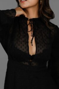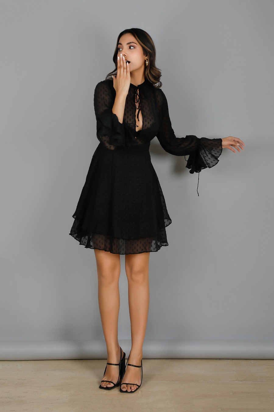 Edgy evening wear handcrafted from soft chiffon dobby fabric, exposed cleavage pattern. Full-length sleeves, added ruffle details at the wrist, belted for a cinched waist.