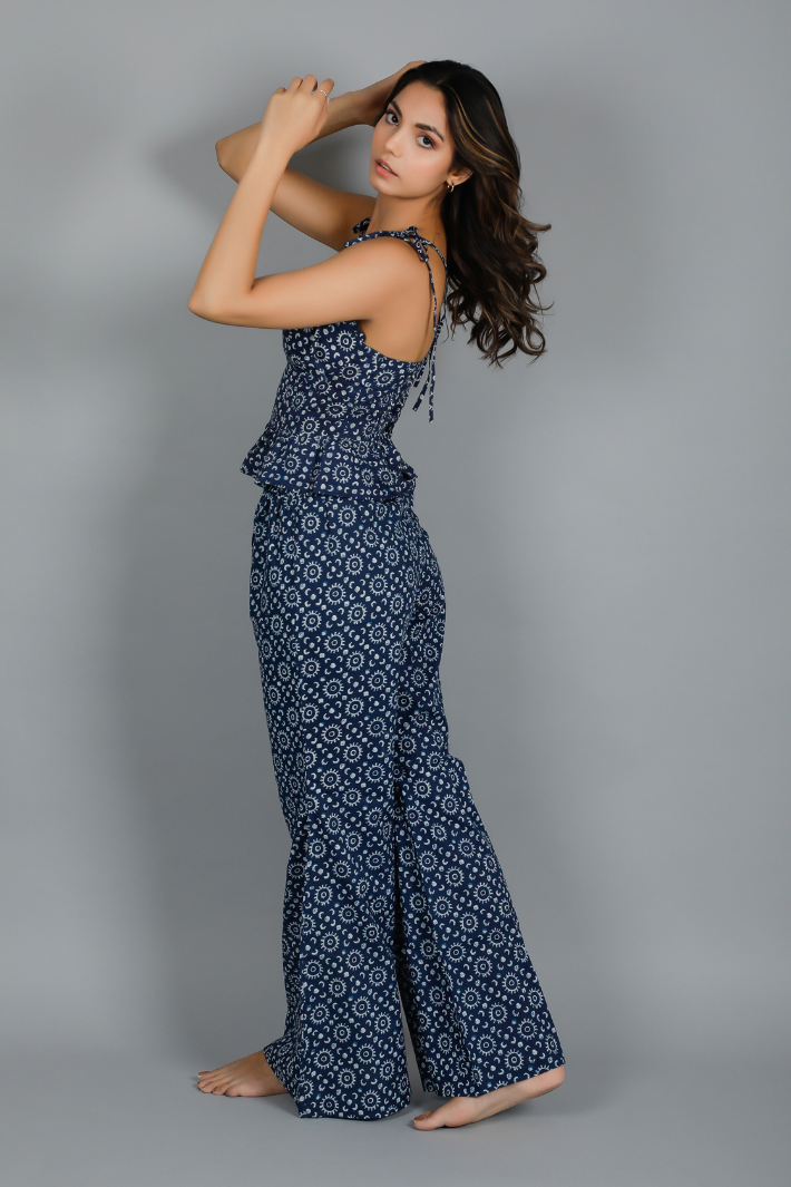 Indulge in the charm of our handcrafted dress, lovingly made in India. The Indigo hand screen print, locally known as Dabu in Jaipur, adds an alluring touch to this piece, which took three days to perfectly drape the upper bodice.