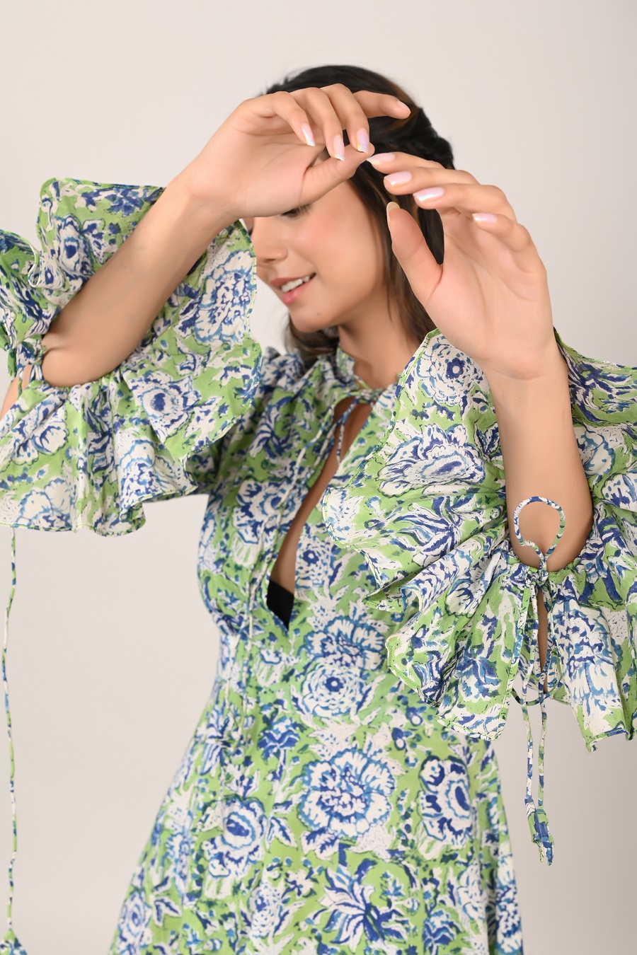Handcrafted luxurious glam with 100% cotton in India. Tailored for perfect fit added with a waist belt to create a cute bow mood at the back. A silhouette-defining piece with a flared bottom for a feminine and laid-back look. Features a bold and beautiful keyhole neckline, extending to the upper waist belt, fastened with a tie-up at the upper neck. A breezy beachy summer dress.