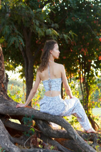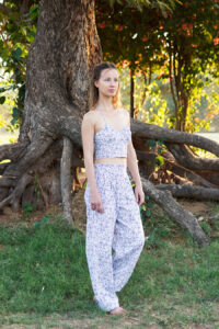 Summer everyday glam in soft cotton material. Cosy co-ord set with playful corset design and pleated straight pants. Halter neckline with crisis cross at the back pattern. Underwire bust support for a seamless fit.