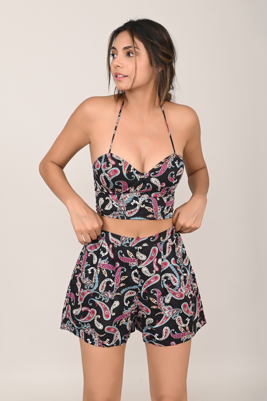 Fan of the tan? A perfect beach co-ord set in breathable cotton fabric. Enjoy breezy weekends in the corset top with crisscross back tie-ups and a halter neckline. Soft fit with underwire support and lightweight material. Deep neckline for flawless flaunt.